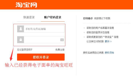 这个授权页面 千万一定要填写你开通电子面单的淘宝账号,不要用阿里巴巴账号授权,否则获取不到电子面单。一定用你开通电子面单的淘宝账号输入授权,提示授权成功后去(电子面单余额查询)功能里面查看是不是有余额,有余额就代表授权是正确的。
