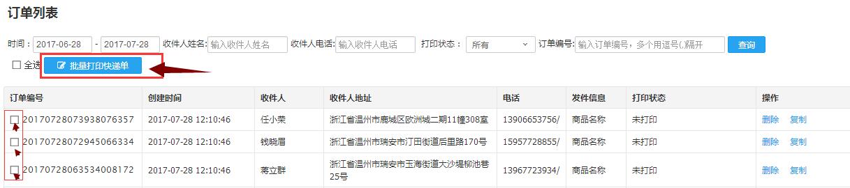 勾选订单前面的 小方框,然后点击批量打印快递单,就打印出来了。