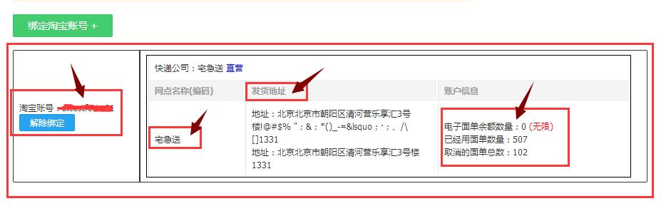 授权完成了,你就看到上图的信息 有你的淘宝账号信息 快递公司 发货地址 以及电子面单的余额。