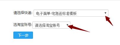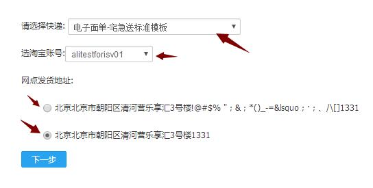 选择了快递 又选择了淘宝账号 你可以看到会出来发货地址 选择一个发货地址,点击下一步 如下图