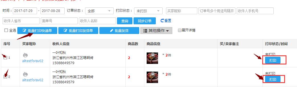 看上图 勾选订单序号可以批量打印 也可以直接点击订单后面的打印按钮 点击打印后看下图