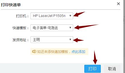 选择 打印机 选择模板 选择发货地址 然后点击打印 就可以打印出来了亲