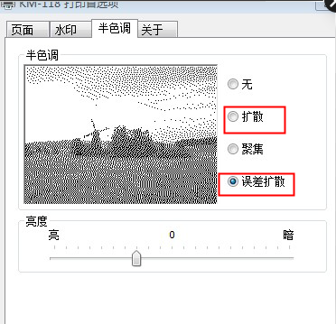 1.以km118为例,打开打印机首选项,半色调设置为“扩散”或“误差扩散”即可正常打印水印了。具体如下图: