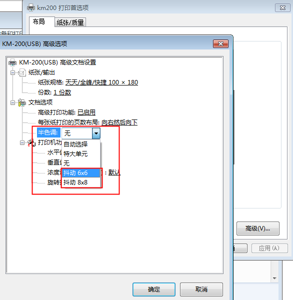 2.有的打印机驱动,半色调设置在高级选项里面,如下图,设置为“抖动6*6”或者“抖动8*8”即可,一般数字越大越细致。具体如下图: