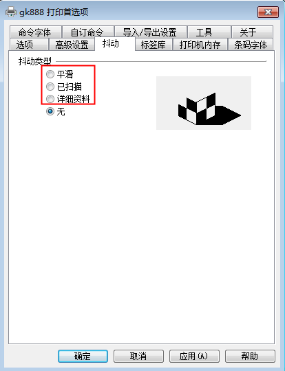 3.还有像斑马打印机的首选项里面,没有半色调的属性,只有抖动属性,这种情况,只要设置前三个类型的任意一个,都可以支持水印的正常打印。建议可以切换抖动类型,选择实际打印效果最好的类型。